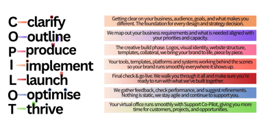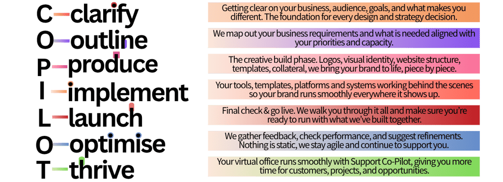 Each letter in CO-PILOT represents a stage in the journey. We guide our clients through, whether they are building a brand from scratch, starting a new business, launching an online store, or scaling a new offer.