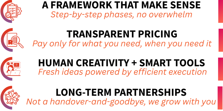 We exist for entrepreneurs and small business owners who want more than a service provider but a partner who understands their goals, anticipates challenges, and makes the process simpler. With us, you don’t just get things designed; you get a framework for growth, accountability to stay on track, and a trusted co-pilot keeping your brand on course.